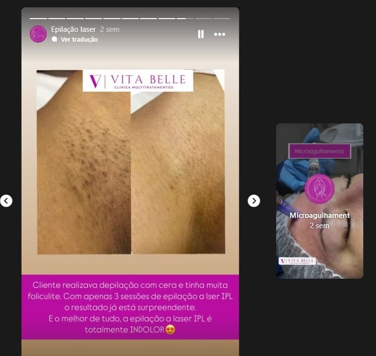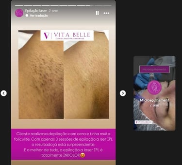"Maravilhosa! As meninas são muito simpáticas e me explicaram tudo, já que eu nunca havia feito. Estou no início das sessões de depilação e estou muito contente, pois o resultado é muito rápido. Indico a Vita Belle e os tratamentos!!! Sucesso a equipe."